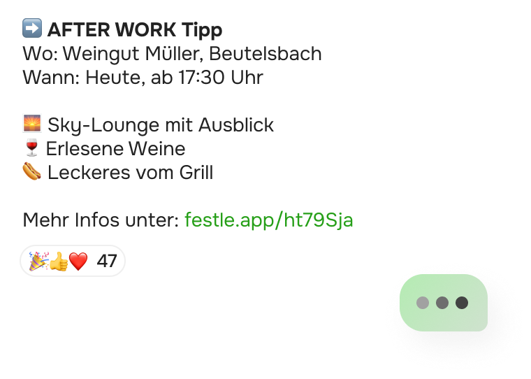 Mit festle bleibst du immer auf dem Laufenden über lokale Veranstaltungen im Rems-Murr-Kreis. Entdecke Events in Städten und Gemeinden wie Waiblingen, Schorndorf, Backnang, Weinstadt, Remshalden und vielen weiteren Orten der Region. Von traditionellen Straßenfesten und Weindörfern bis hin zu Märkten, Konzerten und Vereinsveranstaltungen – festle macht sichtbar, was das regionale Leben auszeichnet. Dank standortbasierter Empfehlungen und interessenbezogener Filter findest du genau die Events, die zu dir passen – egal, ob du neu in der Region bist oder deine Heimat besser kennenlernen möchtest.